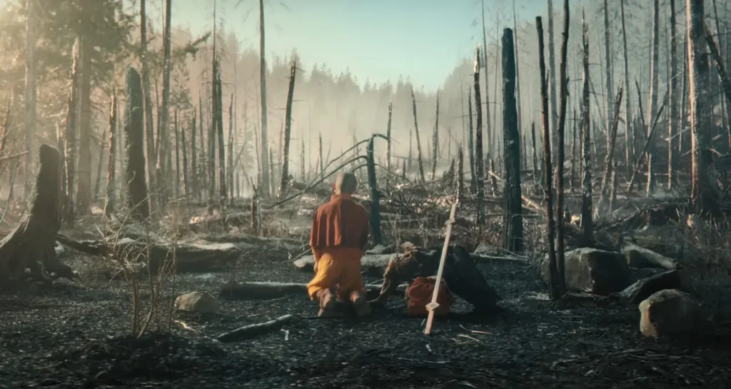 A destruição da floresta é muito semelhante à animação, provando que a Netflix está empenhada em proporcionar fidelidade e emoção aos fãs de Avatar.